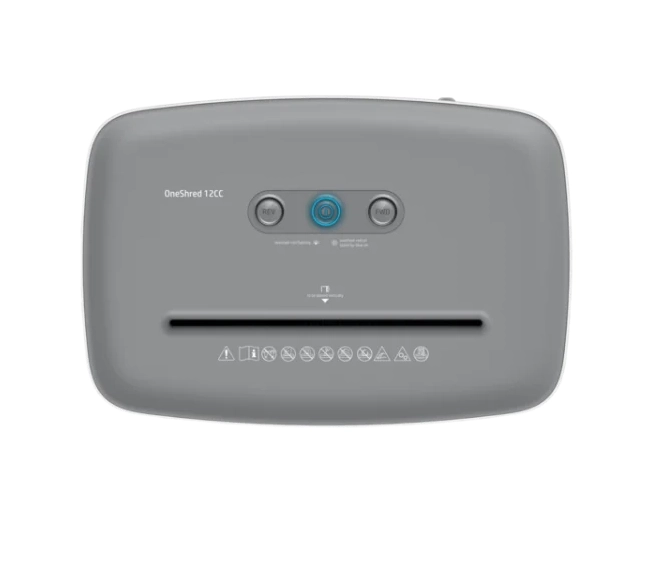 HP OneShred 12CC cross-cut paper shredder with 12-sheet capacity, enhanced document security, auto start/stop, and overheat protection—ideal for home and small office use.