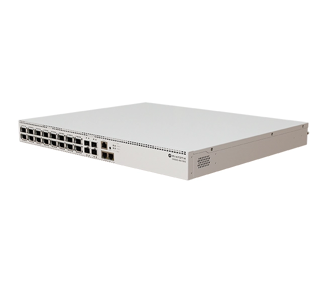 MikroTik CRS520‑4XS‑16XQ‑RM Layer 3 Switch is a 1U rackmount switch with 16× 100G QSFP28, 4× 25G SFP28, and 2× 10G RJ45 ports, powered by a quad-core 2 GHz CPU, 200 Gbps switching, dual hot-swappable PSUs, and full Layer 3 hardware offload—ideal for data centers and high-speed core networks.