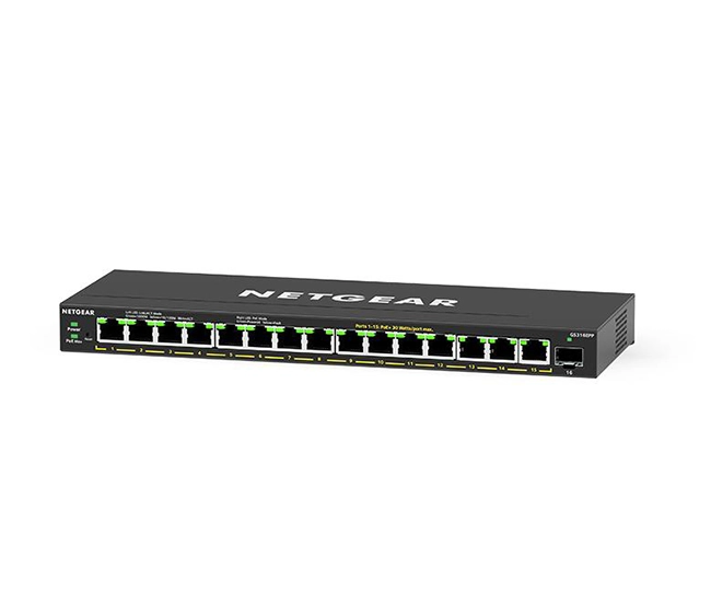 Netgear GS316EPP-100UKS 16-Port Gigabit Plus Switch PoE+, 15 PoE+ ports, 231W power budget, and 1G SFP uplink—silent, reliable, and ideal for SMBs powering IP cameras, APs, and VoIP phones.