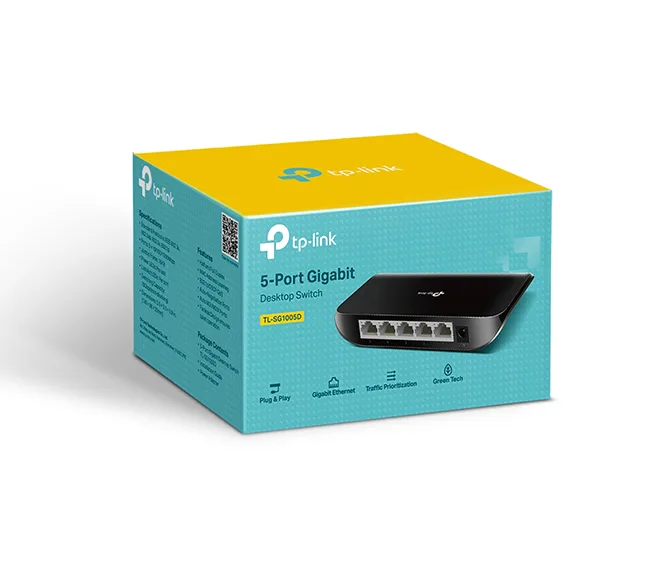 TP-Link 5-Port Gigabit Desktop Switch (TL-SG1005D) is a 5-port Gigabit Ethernet switch with 10 Gbps switching capacity, plug-and-play setup, Green Ethernet technology for power saving, and silent fanless design. Ideal for small offices or high-speed home networks.