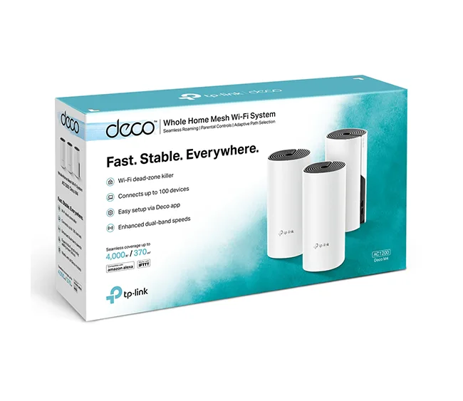 TP-Link AC1200 Whole Home Mesh Wi-Fi System – TL-DECO M4 (3-Pack) is an AC1200 dual-band whole home mesh Wi-Fi system that delivers seamless coverage up to 4,000 sq. ft., supports up to 100 devices, and features advanced mesh technology, parental controls, and easy app-based management.