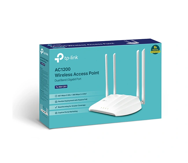 The TP-Link AC1200 Wireless Access Point – TL-WA1201 is a high-performance Wireless Access Point designed for extending and enhancing Wi-Fi coverage in homes, offices, and small businesses. Featuring dual-band AC1200 Wi-Fi, it delivers fast and stable wireless connectivity for streaming, gaming, and multiple device usage. With four high-gain antennas, beamforming technology, and multiple operation modes, the TL-WA1201 ensures strong coverage, flexibility, and reliability.