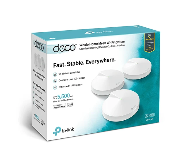 TP-Link AC1300 Whole Home Mesh Wi-Fi System – TL-DECO M5-3 (3-Pack) delivers up to 5,500 sq. ft. mesh Wi-Fi coverage with AC1300 dual-band speeds, quad-core performance, TP-Link HomeCare™ security, parental controls, and seamless roaming for a reliable whole-home internet experience.