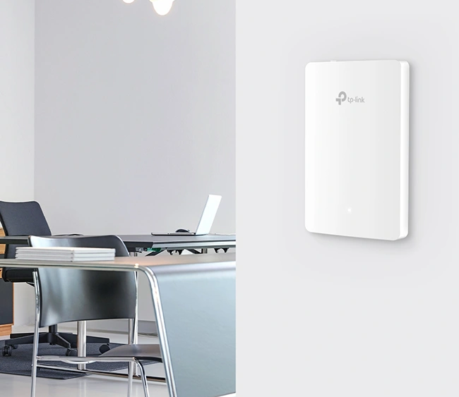 TP-Link AX1800 Wall Plate WiFi 6 Access Point – EAP615-Wall with dual-band speeds, PoE, Gigabit ports, WPA3 security, and Omada SDN management. Perfect for hotels, offices, and dormitories.