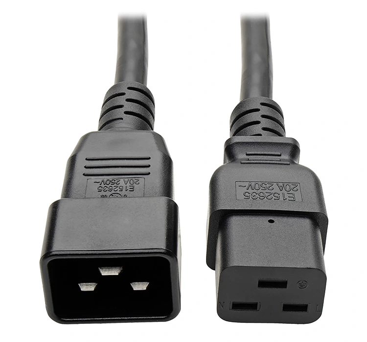 C19 to C20 20A heavy-duty extension cable connects high-output devices with C19/C20 power connectors, including blade server chassis.