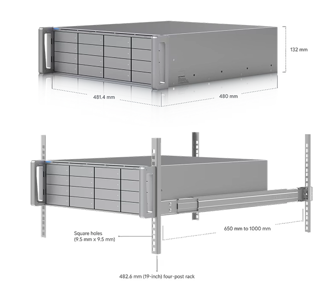 - Slide Rails Support: Supports 482.6 mm (19″) four-post racks with square holes (9.5 × 9.5 mm) and post depths ranging from 650 to 1000 mm (25.6–39.4″)