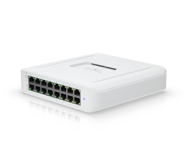 The UniFi USW-Lite-16-PoE is a compact, fanless 16-port Layer 2 Gigabit switch with 8 PoE+ ports, 45W PoE budget, and full UniFi Controller management—perfect for silent, low-power deployments.