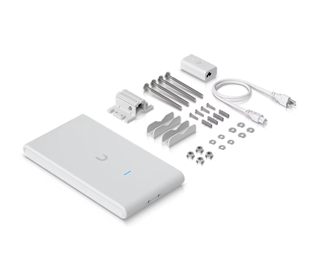 The UniFi U6 Mesh Pro is a high-performance Wi-Fi 6 access point designed for both indoor and sheltered outdoor environments. It supports dual-band Wi-Fi with a maximum throughput of 5.3 Gbps, offering 573.5 Mbps on 2.4 GHz and 4800 Mbps on 5 GHz. The U6 Mesh Pro is powered via 802.3af PoE, features a weather-resistant design (IPX5), and can be easily mounted on walls, ceilings, or poles. Managed through the UniFi Network Controller, it provides advanced features like mesh networking, VLAN support, and seamless roaming for larger, high-traffic areas.